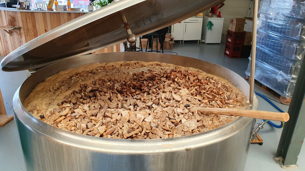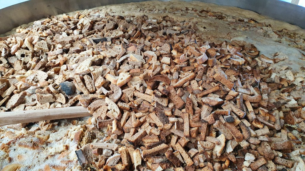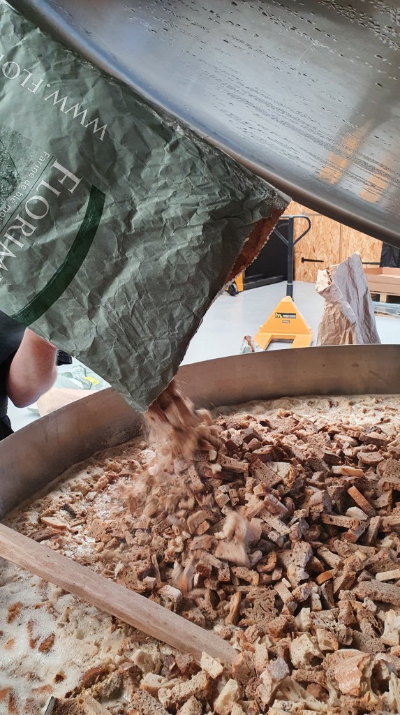 Mais surtout, mélangés avec le malt d’orge lors du brassage, cela nous a permis d’extraire aussi les précieux sucres que renferme le pain et qui participeront à la production d’alcool ! En plus d’éviter de jeter ce pain, nous utilisons un peu moins de malt d’orge (25% de pains secs), que demander de mieux